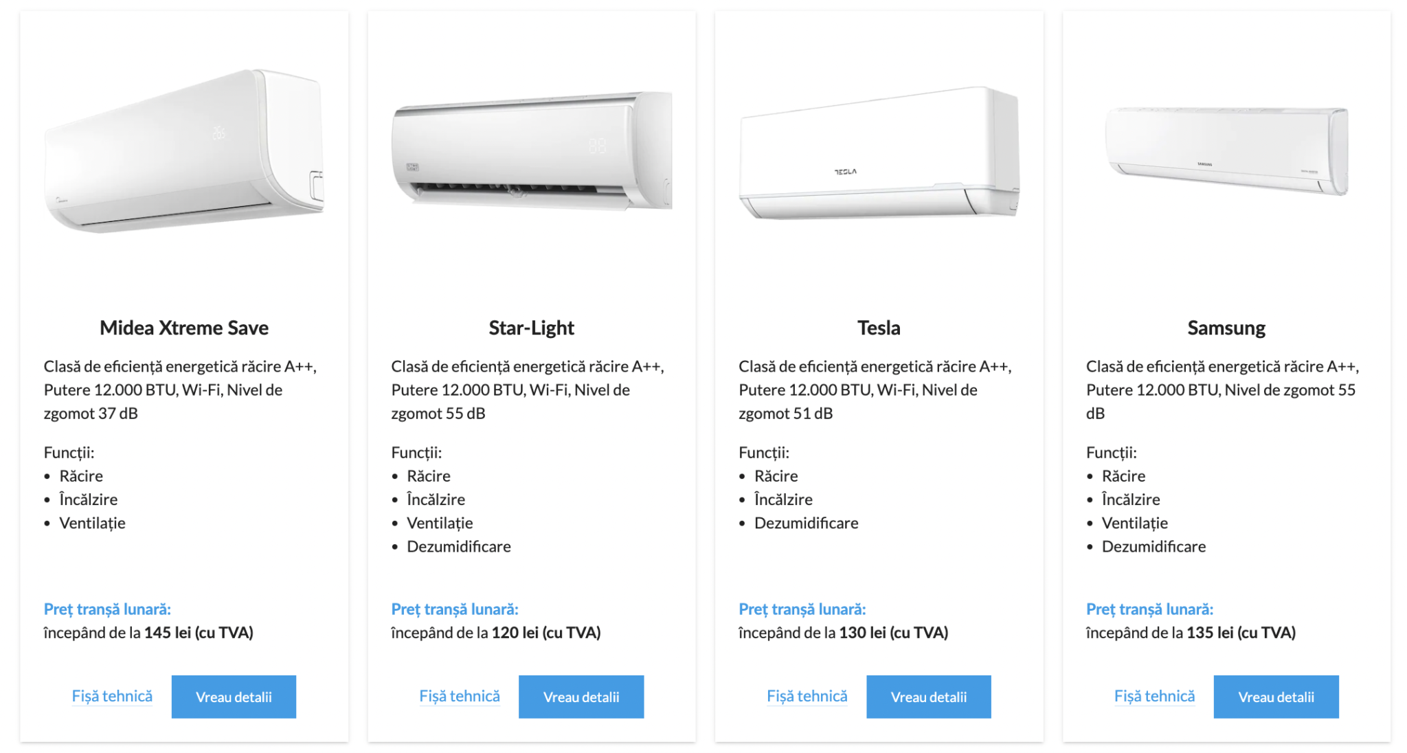 | Model | BTU | Clasă răcire | Zgomot | Wi-Fi | Ideal pentru |